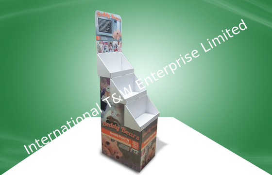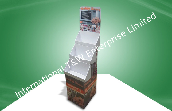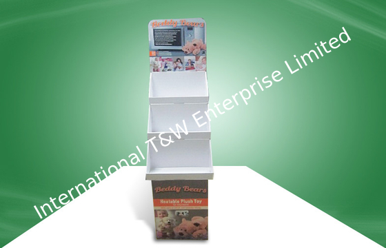 Le esposizioni riciclate del cartone di posizione del Tre-vassoio, giocattoli della peluche pavimentano il banco di mostra